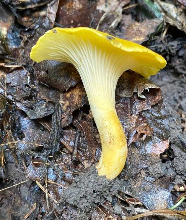 The cap, fertile surface (hymenium), and stem are all yellow, though often greenish-yellow hues can be present when immature. This mushroom is not composed of true gills. Instead, the spore producing surface is constructed by wavy, forking ridges that run down the stem (decurrent). These ridges aren't easily separable from the mushroom which would be more typical of true "gills".