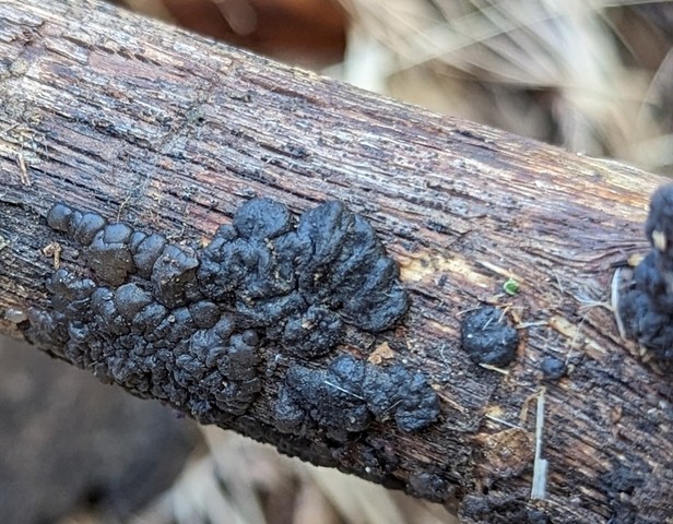 Exidia glandulosa appears in spring and fall on dead branches of broadleaf trees. It grows in scattered patches or loose clusters. The species name means "glandular," a reference to the jelly-like, lobed appearance of its fruiting bodies.
