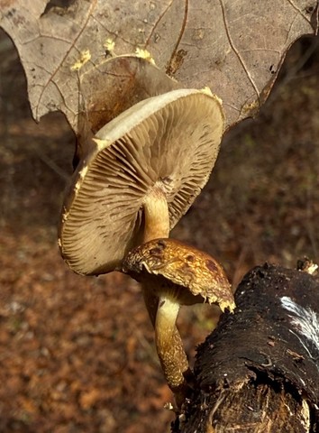 Growing on fallen American Hophornbeam tree in open mixed oak/hickory woodland edge.