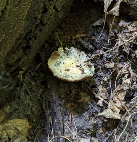 Growing from soil/duff near fallen hardwood branch in low riparian woodland area.